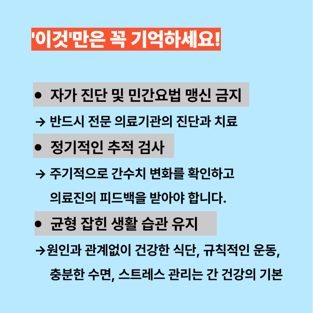 - 균형 잡힌 생활 습관 유지: 원인과 관계없이 건강한 식단, 규칙적인 운동, 충분한 수면, 스트레스 관리는 간 건강의 기본입니다.