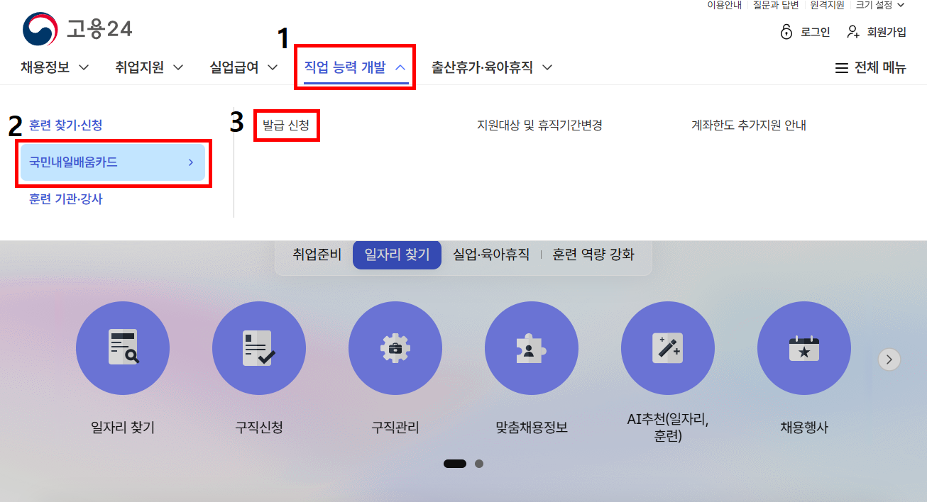 국민내일배움카드 신청은 고용24(www.work24.go.kr)에서 가능합니다. 홈페이지에 접속하여 회원가입 후 로그인해 주세요. (2025년 8월 기준) - STEP 2. 카드 발급 신청