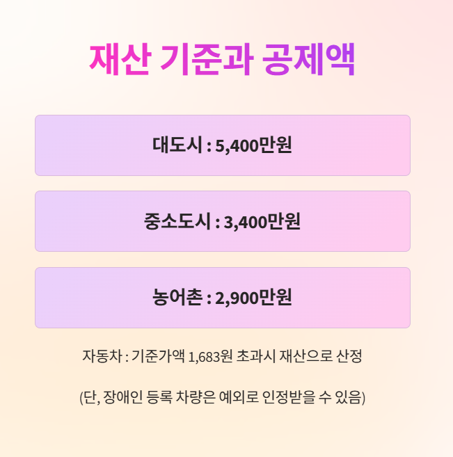 재산은 일반재산, 금융재산, 자동차 등으로 나뉘며, 지역에 따라 일정한 금액이 기본재산으로 공제됩니다.