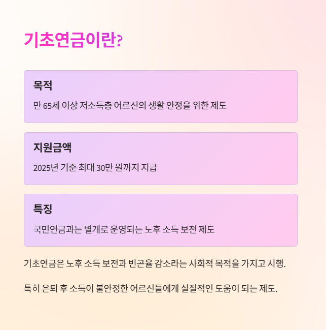 기초연금은 고령층의 소득보장을 위해 마련된 제도로, 만 65세 이상의 저소득 어르신들에게 지급됩니다.