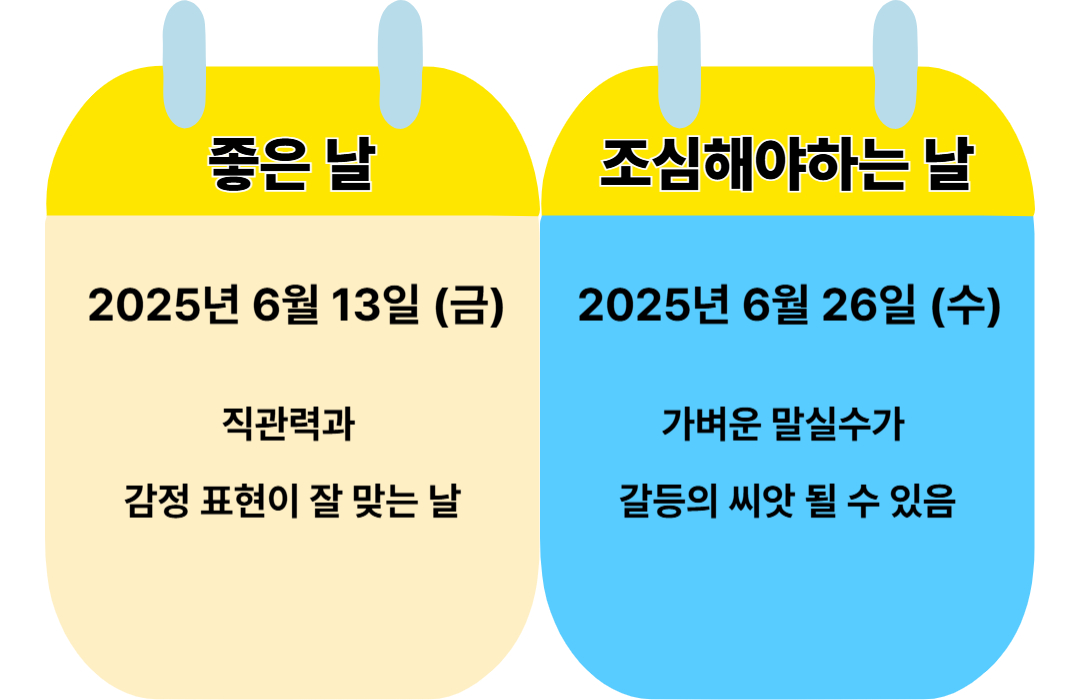• 조심할 날: 2025년 6월 26일 (수) – 가벼운 말실수가 갈등의 씨앗 될 수 있음