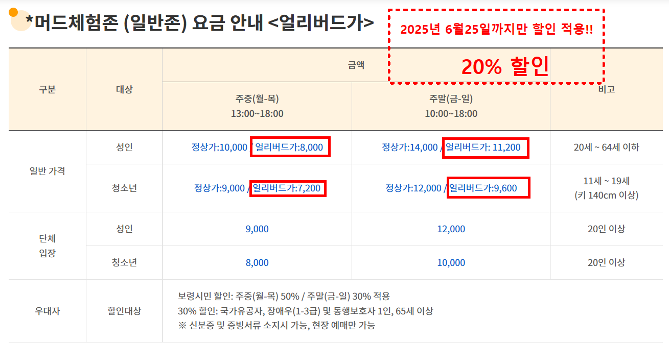 얼리버드 티켓 가격표 (2025년 기준)