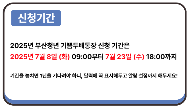 - 2025년 부산청년 기쁨두배통장 신청 기간은 2025년 7월 8일 (화) 09:00부터 7월 23일 (수) 18:00까지입니다. 기간을 놓치면 1년을 기다려야 하니, 달력에 꼭 표시해 두고 알람 설정까지 해두세요!