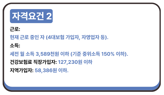 - 근로 여부: 현재 근로 중인 자 (4대보험 중 1개 이상 직장가입자, 자영업자 포함)