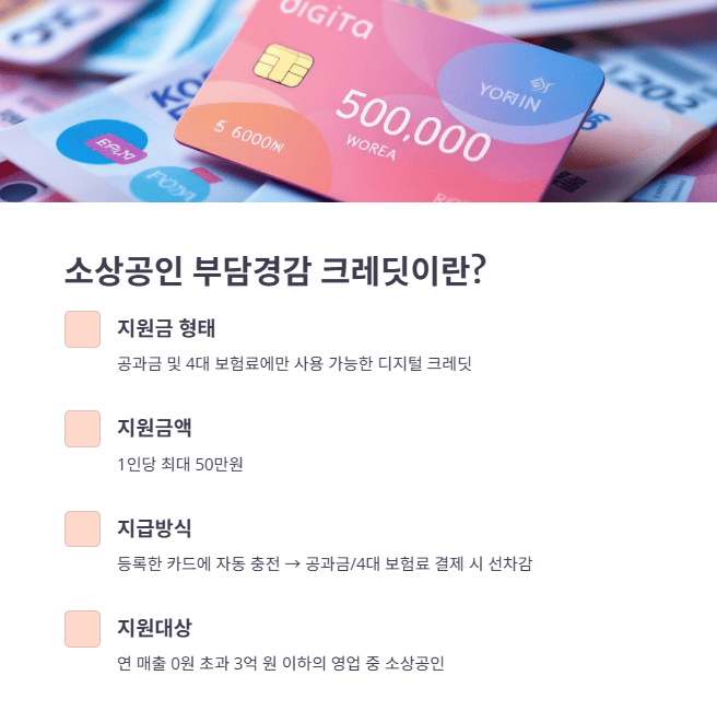 - 지원금 형태: 공과금 및 4대 보험료에만 사용 가능한 디지털 크레딧