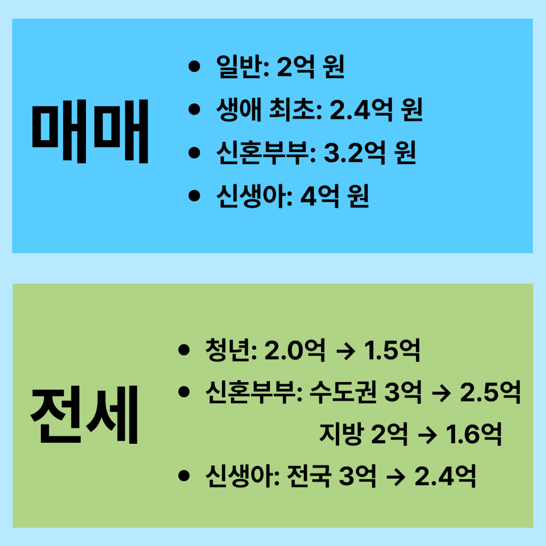 - 신혼부부: 수도권 3억 → 2.5억, 지방 2억 → 1.6억