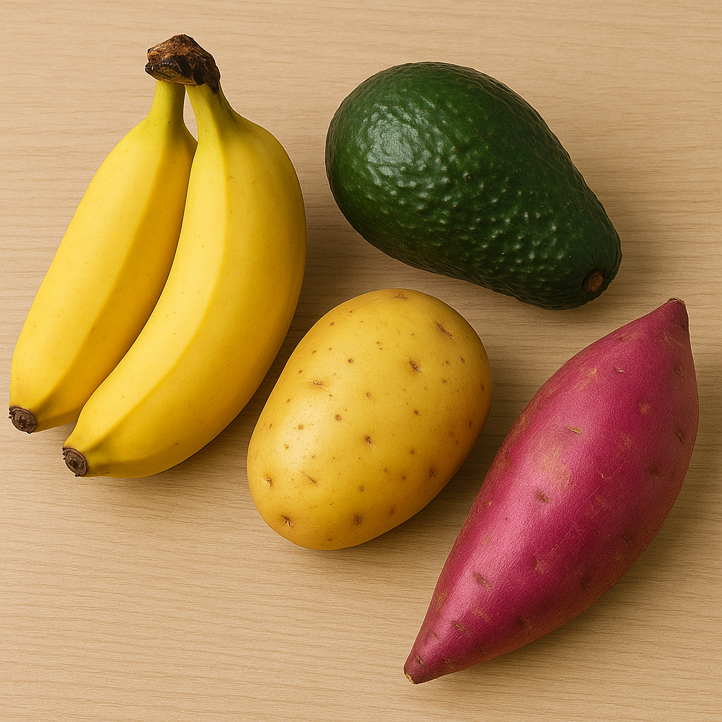 - 칼륨: 바나나, 아보카도, 감자, 고구마, 시금치, 콩류