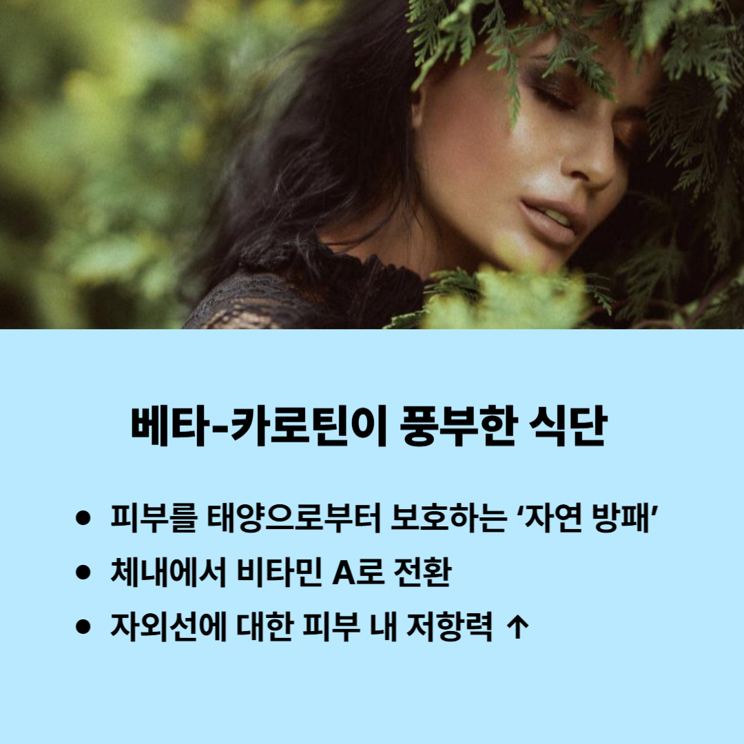 베타-카로틴은 피부를 태양으로부터 보호하는 ‘자연 방패’ 같은 역할을 해요. 체내에서 비타민 A로 전환되며, 자외선에 대한 피부 내 저항력을 높여줄 수 있습니다.