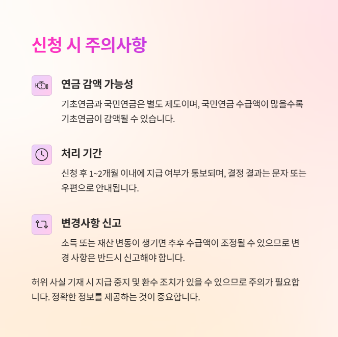 - 소득 또는 재산 변동이 생기면 추후 수급액이 조정될 수 있으므로 변경 사항은 반드시 신고해야 합니다.