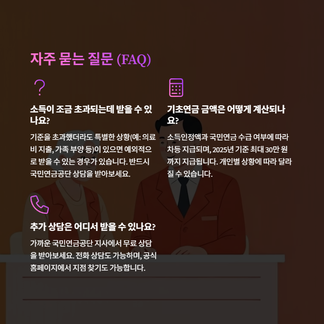 A. 기준을 초과했더라도 특별한 상황(예: 의료비 지출, 가족 부양 등)이 있으면 예외적으로 받을 수 있는 경우가 있습니다. 반드시 국민연금공단 상담을 받아보세요.