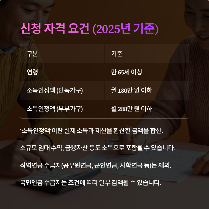 2025년 기준 기초연금 신청 자격은 다음과 같습니다: