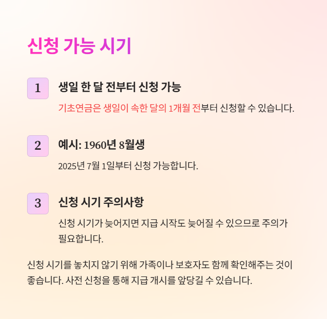 예를 들어 1960년 8월생이라면, 2025년 7월 1일부터 신청 가능합니다. 이는 사전 신청을 통해 지급 개시를 앞당기기 위한 제도로, 신청 시기가 늦어지면 지급 시작도 늦어질 수 있으므로 주의가 필요합니다.