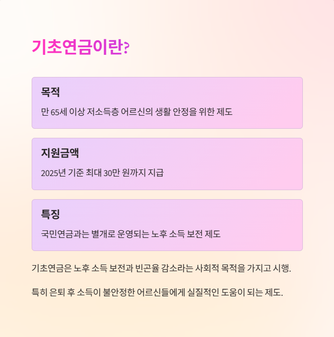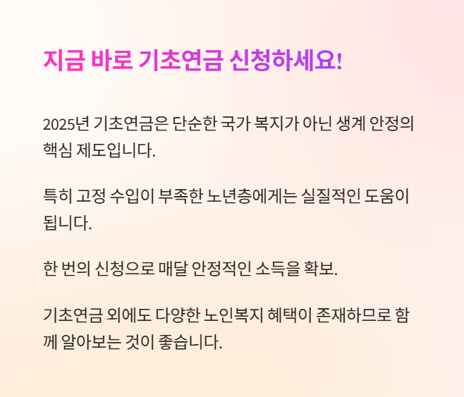 2025년 기초연금은 단순한 국가 복지가 아닌 생계 안정의 핵심 제도입니다. 특히 고정 수입이 부족한 노년층에게는 실질적인 도움이 됩니다.