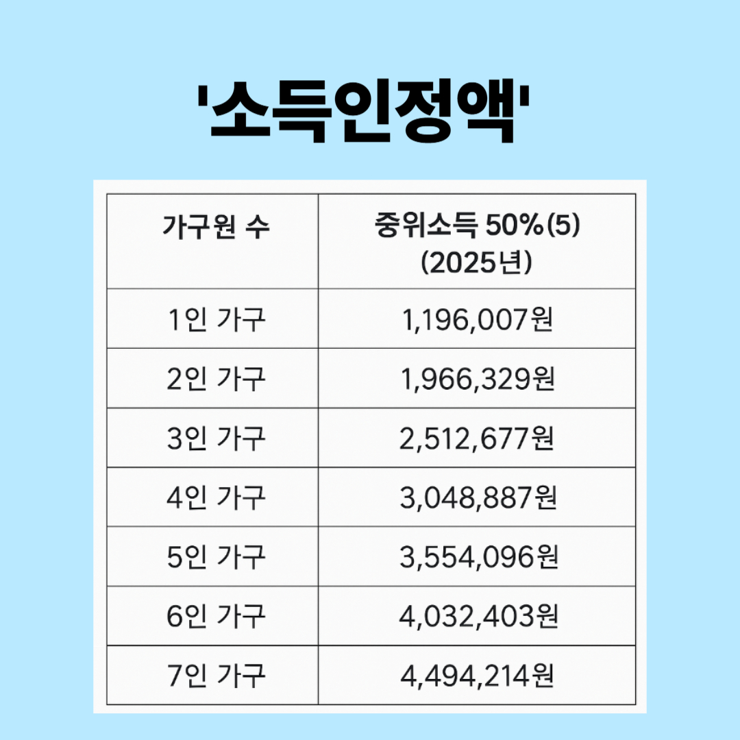| 가구원 수 | 2025년 기준 중위소득 50% |