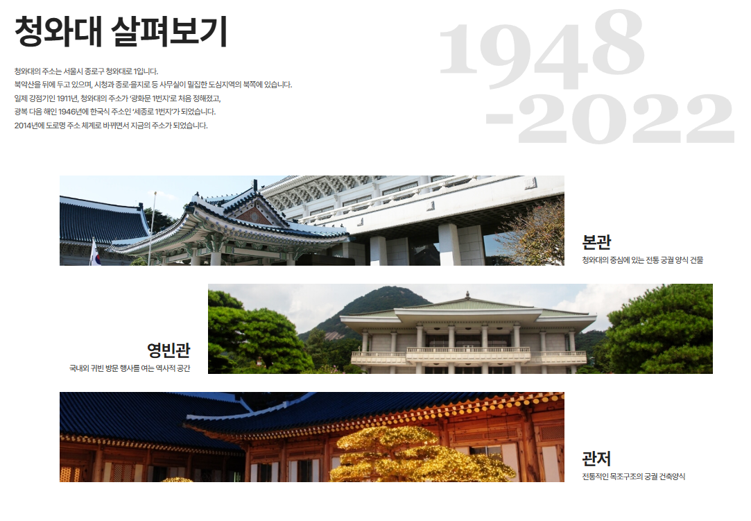 | 본관 | 대통령 집무실 및 회의실 견학 가능 |