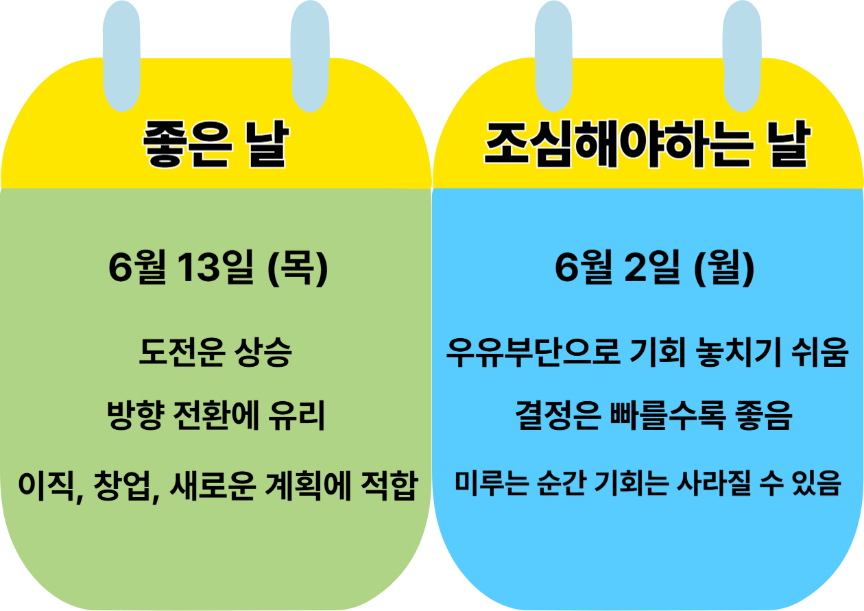 • 조심할 날: 6월 2일 (월) – 우유부단으로 기회 놓치기 쉬움