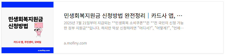 | 민생회복지원금 신청방법 완전정리|카드사 앱, 주민센터, 모바일 어디서든 가능! (2) | 2025.07.19 |
